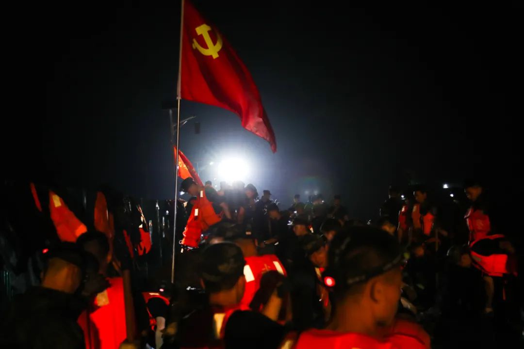 這是一場特殊的出征儀式。抗洪的大堤上,面對鮮紅的黨旗,一群擔負突擊任務的官兵們,拳頭緊握,向黨宣誓,朝著洶涌的洪水,堅定地走去。