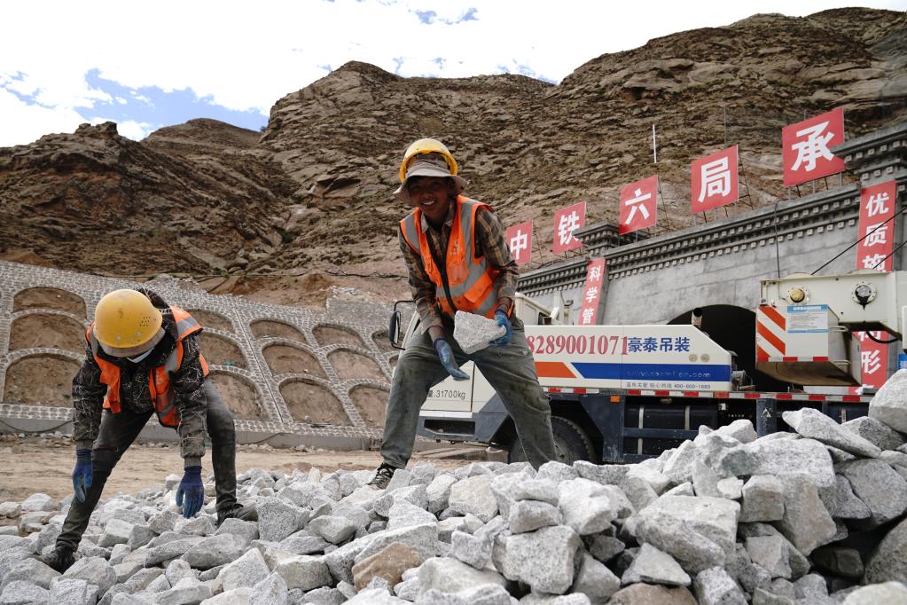 在拉薩市忠材山隧道施工現(xiàn)場,20歲的旦增索朗(右一)正在進行漿砌片石選材作業(yè)(2021年6月26日攝)。 新華社記者劉洪明 攝