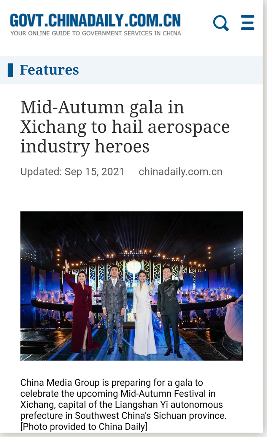 《中國日報》刊發英文報道《Mid-Autumn gala in Xichang to hail aerospace industry heroes》,對晚會選址、舞美、節目等方面體現出的“秋晚品質”加以肯定。報道評價道:“從目前公開的內容來看,無論是與晚會契合度極高的巧妙選址,還是科技與藝術效果交融,古今結合的舞美效果,以及精心雕琢傳遞多重關懷的節目編排,都體現了今年秋晚的品質與匠心”。《時代論壇報》刊發題為《2021中秋晚會:匠心雕琢 娓娓道來中秋的故事》的文章,也著重報道了晚會的匠心之筆。