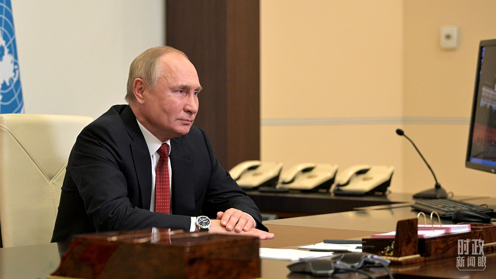 △俄羅斯總統普京、法國總統馬克龍通過視頻方式致辭。