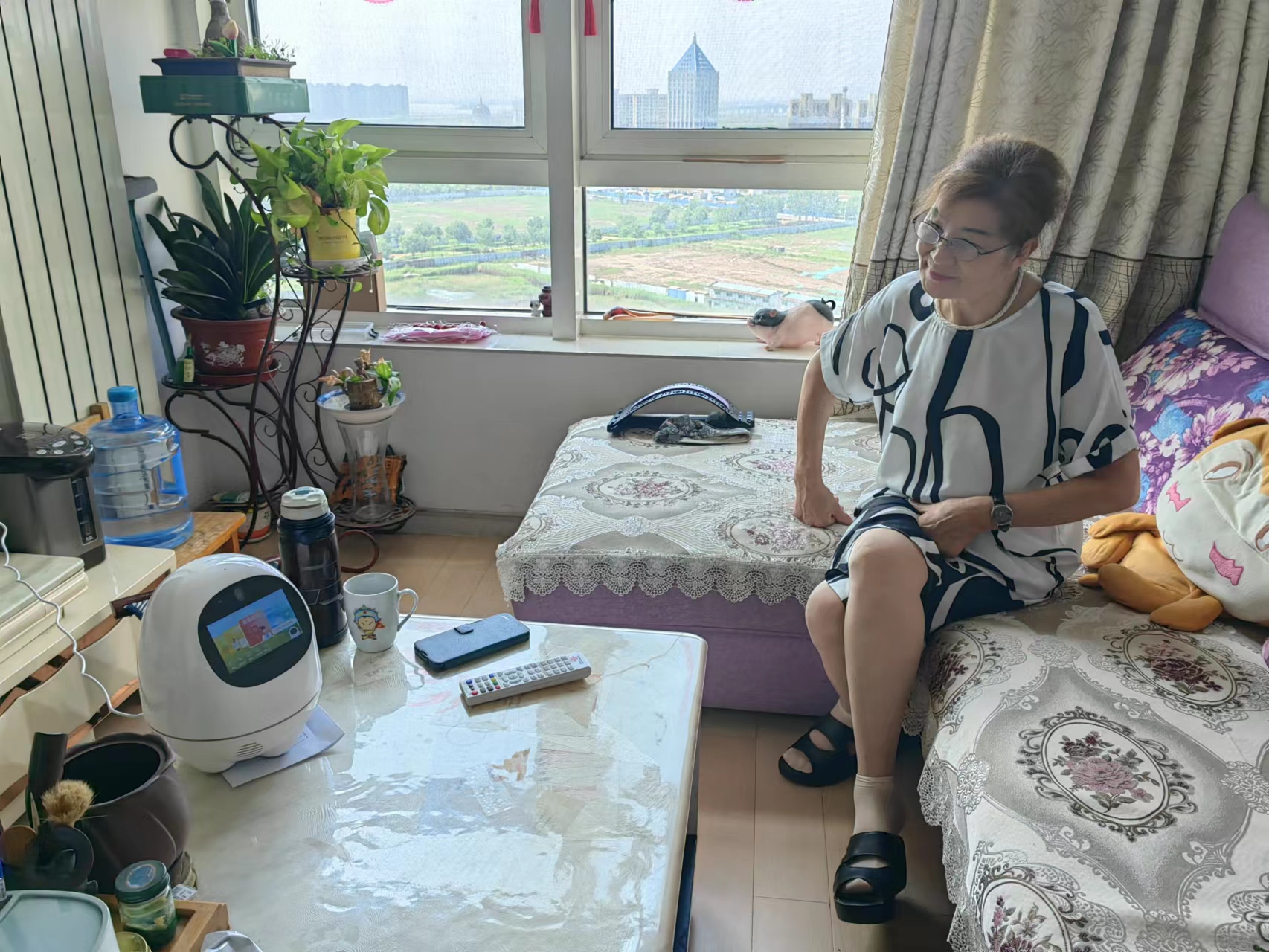 每天早晨起來,王玉英都會和機器人“蛋蛋”進行交流。王玉英說:“‘蛋蛋’每天會提醒我去社區模特隊排練,還能和我聊天,會告訴我天氣、菜價。女兒打電話也都打給‘蛋蛋’,通過蛋蛋我能和女兒視頻通話!