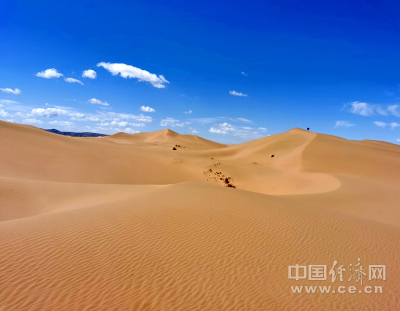 6月27日,“2022中國有約 A Date with China”采訪團來到寧夏中衛沙坡頭國家級自然保護區,探訪騰格里沙漠邊緣的“綠色屏障”。這里是歷史上受風沙災害最為嚴重的地區之一,在與沙漠的不懈抗爭中,人民創造了“草方格”治沙法,建設生態防護林、生態經濟林,形成“綠色屏障”,實現“人進沙退”。圖為騰格里沙漠的漫漫黃沙。中國經濟網記者 馬常艷攝