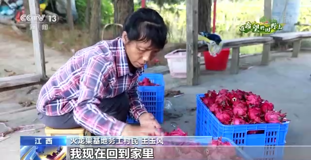 火龍果基地務工村民 王玉風:以前在外面打工,我現在回到家里,家里發展得很好。我現在在這里做事,3000多塊一個月,照顧著小孩,照顧著老人。