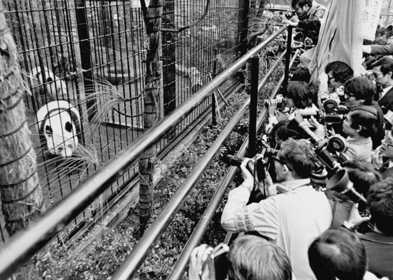 1972年10月28日,第一批旅日大熊貓“康康”和“蘭蘭”乘專機抵達東京,時任內閣官房長官二階堂進親自前往機場迎接。從機場到上野動物園,一路由警車開道、百余名警備人員護送。同年11月初,“康康”和“蘭蘭”首次公開亮相時,6萬名游客將上野動物園擠得水泄不通。次年,上野動物園入場人數創下920萬人的最高紀錄。日本動漫《櫻桃小丸子》曾再現當時全民轟動爭相一睹大熊貓的場面。