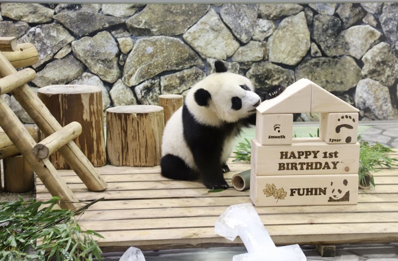 這是2021年11月22日在日本和歌山縣拍攝的大熊貓幼崽“楓浜”生日會現場。新華社記者姜俏梅攝