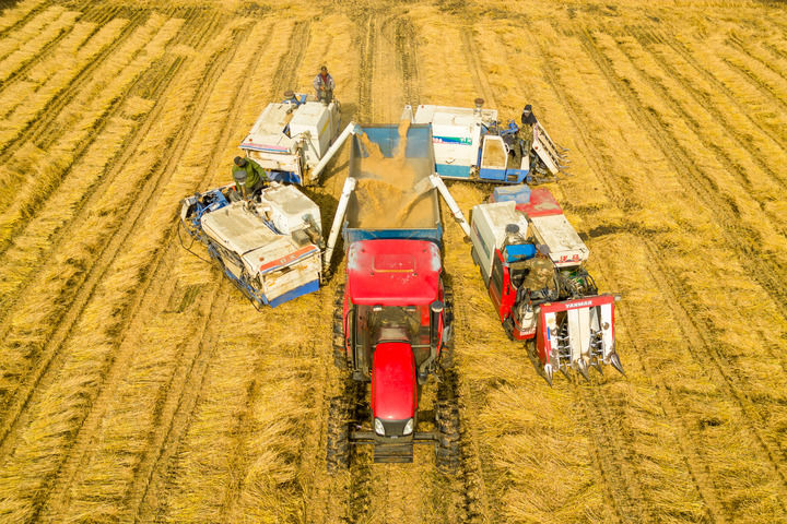 2024年10月13日,在黑龍江省綏化市北林區(qū)雙河鎮(zhèn)稻香村,村民駕駛農(nóng)機(jī)進(jìn)行卸糧作業(yè)(無人機(jī)照片)。新華社記者 張濤 攝