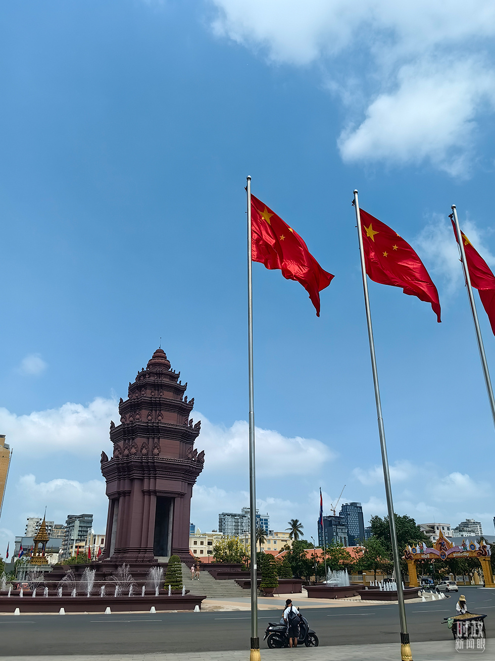 △柬埔寨獨(dú)立紀(jì)念碑前懸掛的中國國旗。(總臺(tái)央視記者段德文拍攝)