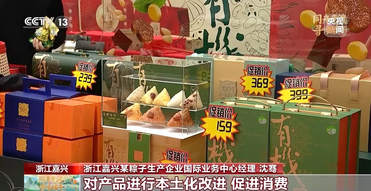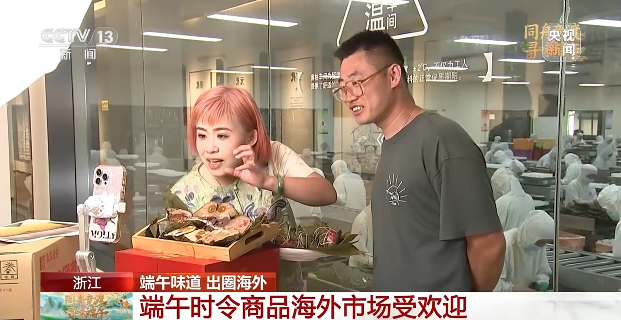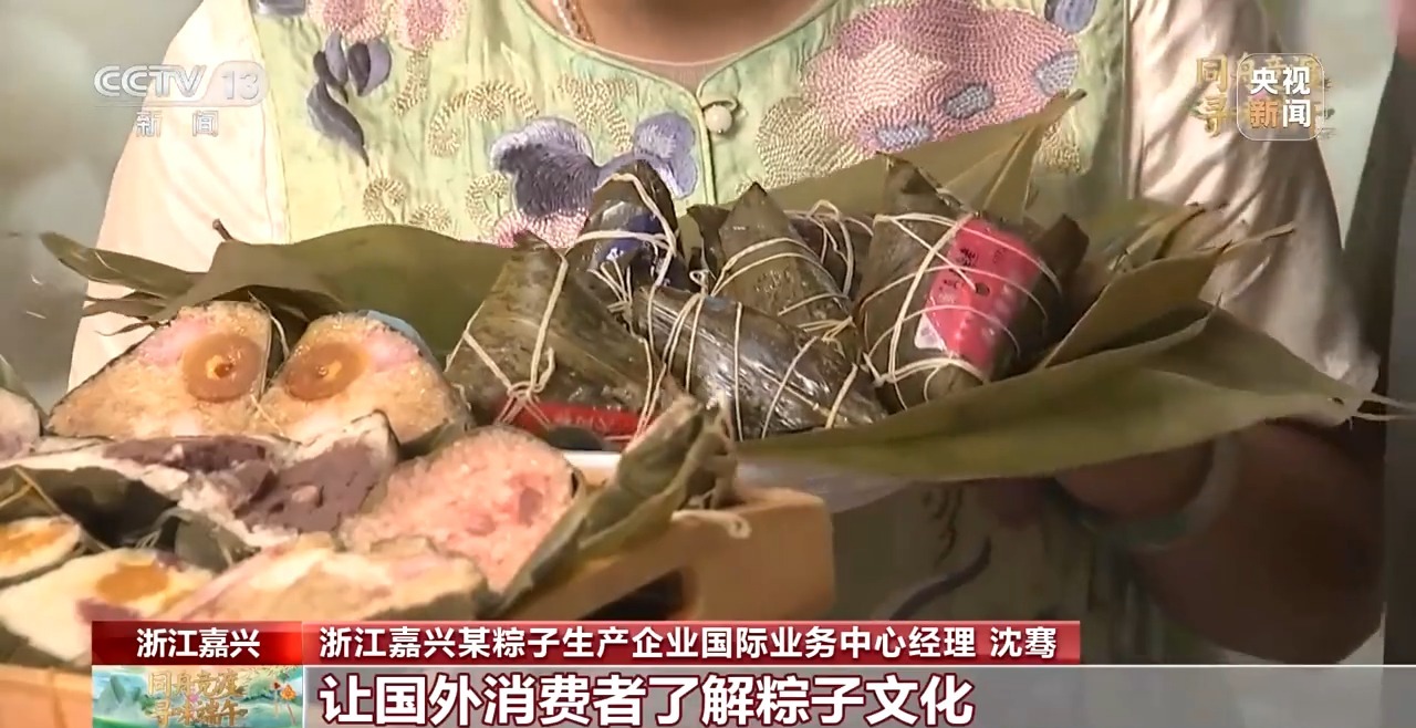 浙江嘉興某粽子生產企業國際業務中心經理 沈騫:我們在直播中會展示粽子制作過程、食品溯源以及科普習俗,讓國外消費者了解粽子文化。我們還積極參加一些國內外的展會,結合當地文化和消費習慣,對產品進行本土化改進,促進消費。今年,我們的粽子出口到了柬埔寨的商超和網購平臺,在韓國大棗粽和豆沙粽非常受歡迎。