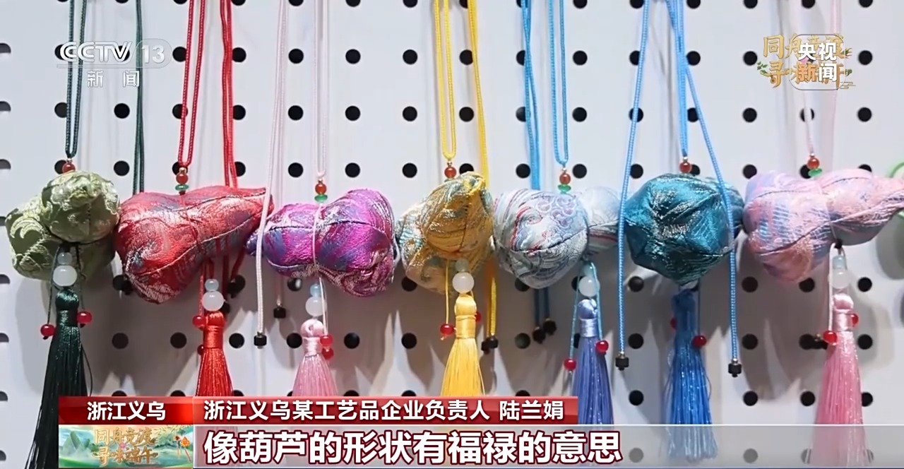 義烏某工藝品企業負責人 陸蘭娟:今年,在香囊的外觀設計上面,我們結合了中國傳統節日祝福的元素,設計了立體葫蘆、柿子等款式。像葫蘆的形狀有福祿的意思;柿子有事事如意的寓意,都是今年的“爆款”。