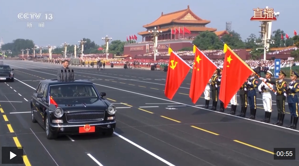 偉大旗幟光耀千秋。中國共產黨黨旗、中華人民共和國國旗、中國人民解放軍軍旗在受閱部隊最前方迎風招展。檢閱車行進至黨旗、國旗、軍旗前,敬禮號角響起,習近平停車肅立,以注目禮向三面旗幟莊嚴致敬。