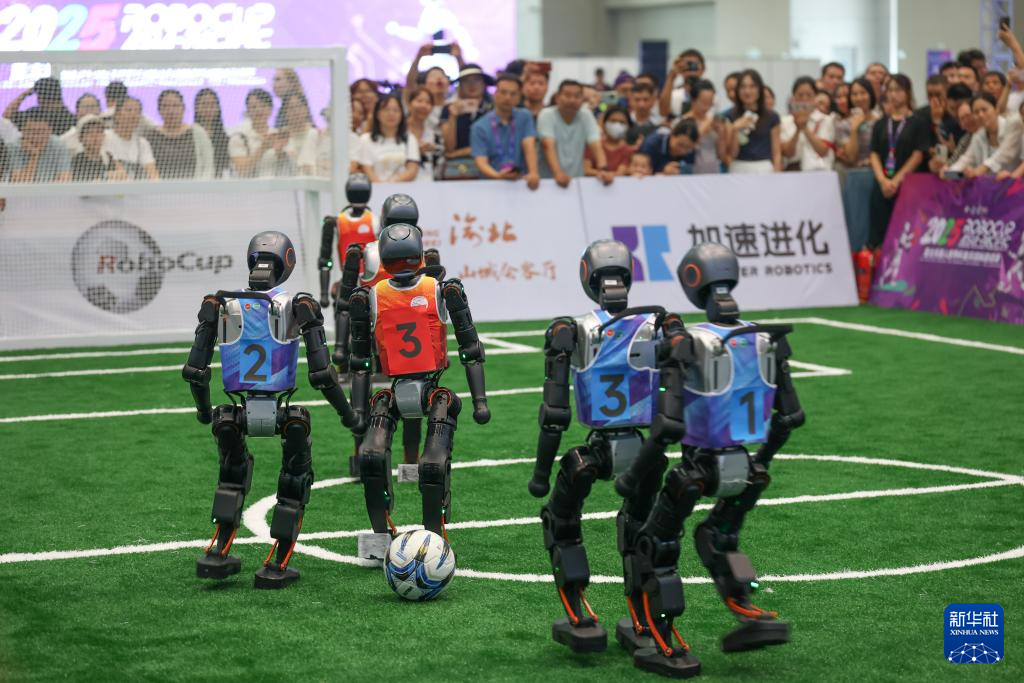 這是9月5日在2025世界智能產(chǎn)業(yè)博覽會(huì)拍攝的機(jī)器人3V3足球賽。