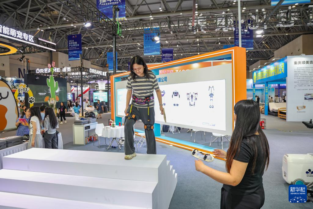 9月5日,觀眾在2025世界智能產(chǎn)業(yè)博覽會(huì)上體驗(yàn)外骨骼機(jī)器人。