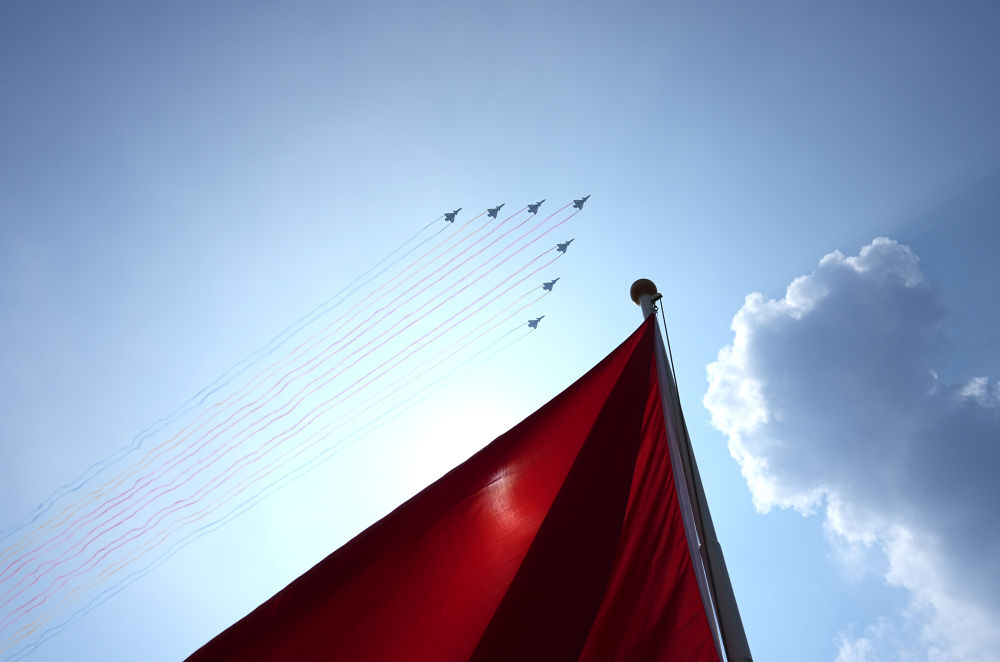 2025年9月3日,紀念中國人民抗日戰爭暨世界反法西斯戰爭勝利80周年大會在北京隆重舉行。這是教練機梯隊接受檢閱。新華社記者 朱崢 攝
