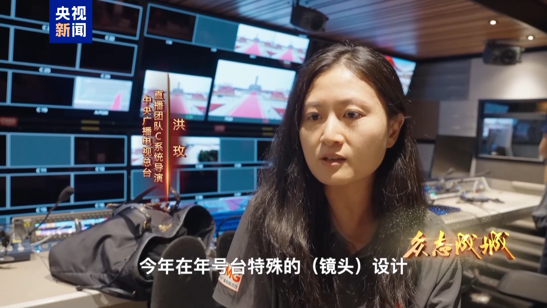 中央廣播電視總臺直播團隊C系統導演 洪玫:今年在年號臺的特殊鏡頭設計,我們也設計了伸縮臂制作的長鏡頭。它體現的是從“1945”到“2025”這樣的一個歷史長河當中,我們既珍愛和平,又有這種能力來捍衛和平的一種精神和力量,所以我們希望能夠用我們的鏡頭語言,也能夠詮釋出這樣的一種含義。