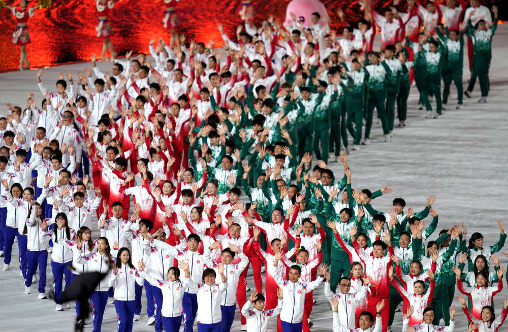 廣東省體育代表團(tuán)、香港特別行政區(qū)體育代表團(tuán)和澳門特別行政區(qū)體育代表團(tuán)在入場儀式上共同入場。新華社記者江漢攝