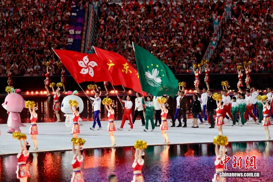 11月9日晚,第十五屆全國運動會開幕式在廣東奧林匹克體育中心舉行。圖為東道主廣東、香港、澳門體育代表團同時入場。中新社記者 富田 攝