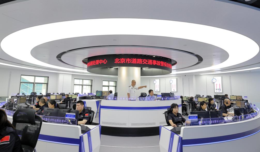2025年5月23日,在北京市公安局交管局北京道路交通事故警保合作遠程處理中心,事故處理支隊支隊長于海濤(中)和民警在統籌調度全市輕微交通事故警情遠程處置工作。新華社記者 殷剛 攝