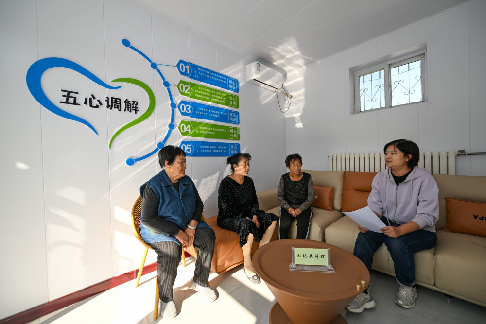 在天津市寧河區蘆臺街道金華路社區,社區黨總支副書記吳蕊(右一)就社區監控設備安裝問題為社區居民進行解答(2024年10月11日攝)。金華路社區積極踐行新時代“楓橋經驗”,將原社區居委會閑置用地提升改造成為聯絡群眾的基層綜合治理陣地——“解鈴小院”。新華社記者 孫凡越 攝