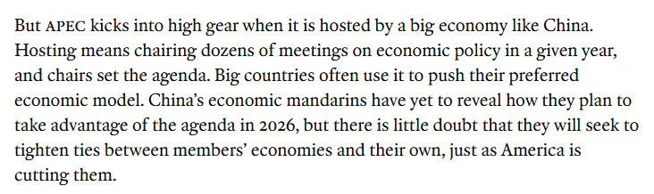 文章注意到,2025年,中國與東盟正式簽署自貿區3.0版升級議定書。2026年底,亞太經合組織(APEC)第三十三次領導人非正式會議將在中國舉行,占世界經濟總量五分之三的成員經濟體代表將齊聚中國。在當前國際經濟格局不確定的背景下,中國正積極布局更開放的經濟合作,展現出與美國截然不同的經濟伙伴姿態。