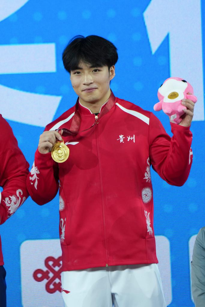 ↑11月18日,獲得冠軍的貴州隊選手雷江清在頒獎儀式上展示金牌,他身上的貴州代表隊服裝上繡著傳統紋飾。新華社記者 楊晨光 攝