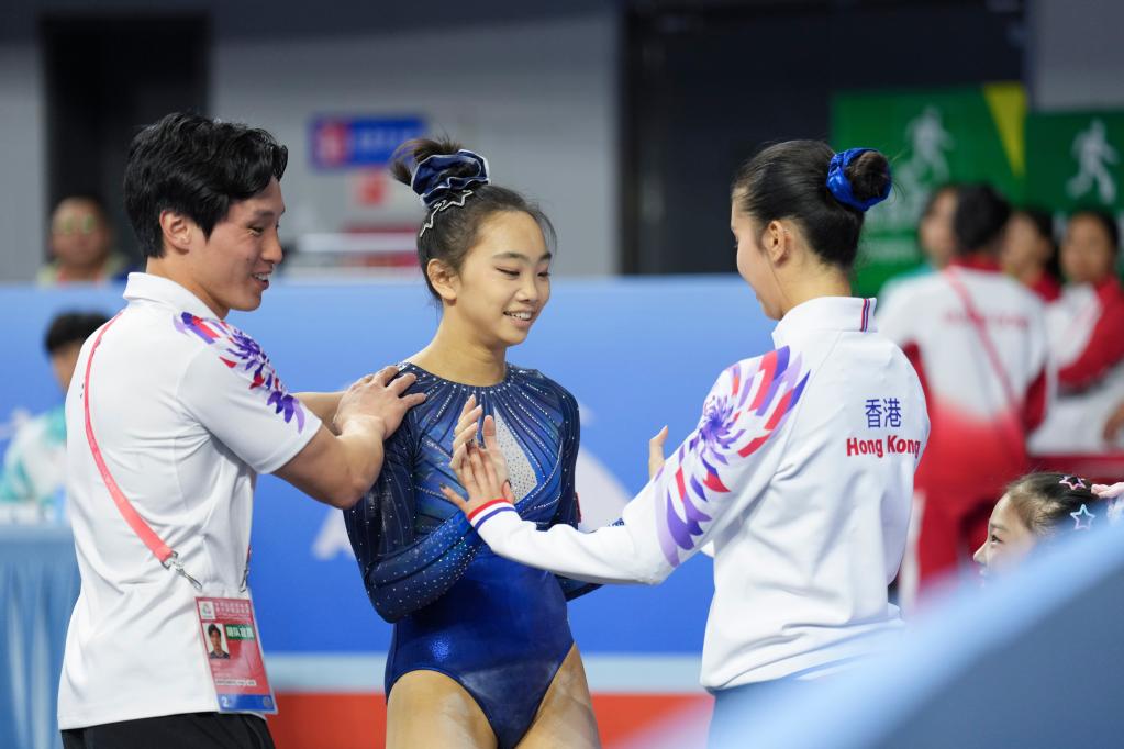 ↑11月11日,香港隊選手曾凱緣(中)在平衡木比賽完賽后與教練(左)、隊友一起慶祝。新華社記者 胥冰潔 攝
