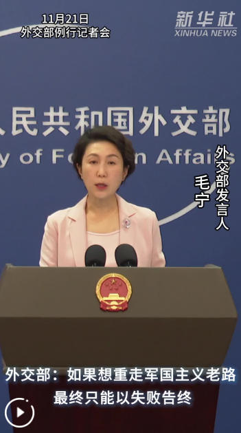 新華社北京11月21日電(記者曹嘉玥、董雪)外交部發(fā)言人毛寧11月21日表示,日本正在突破專(zhuān)守防衛(wèi),加緊“重新武裝”,人們不禁要問(wèn),究竟意欲何為?如果日本想重走軍國(guó)主義老路,最終只能以失敗告終。