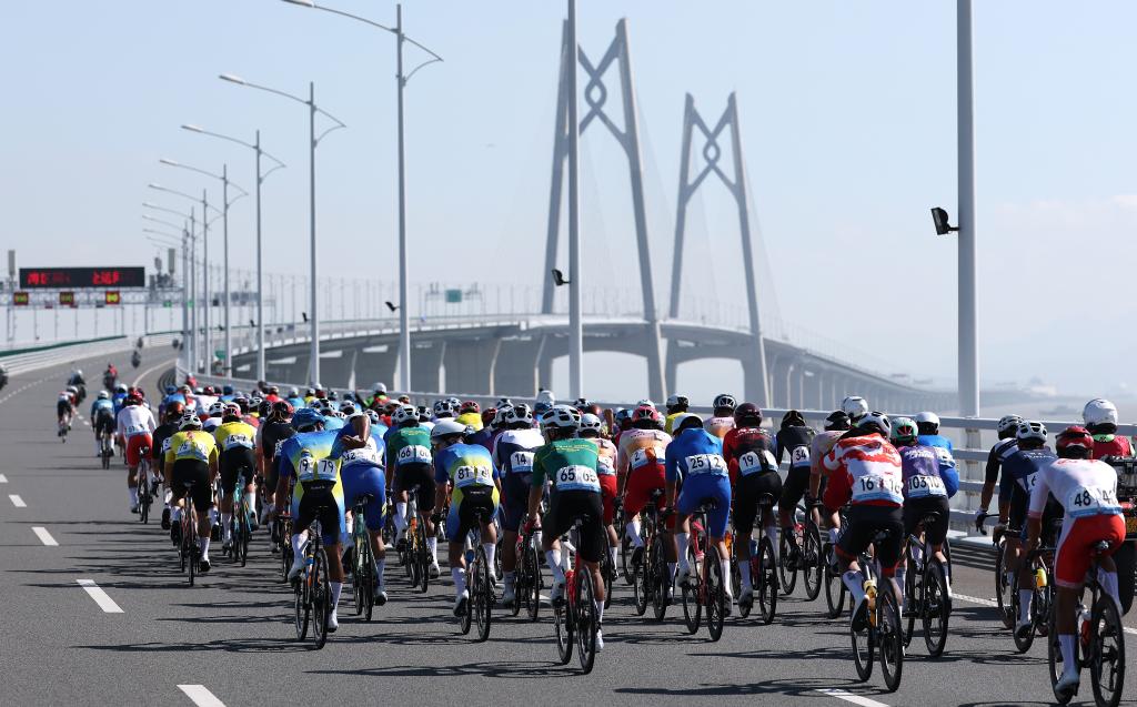 11月8日,參賽選手在港珠澳大橋騎行。當日進行的第十五屆全國運動會公路自行車男子個人賽,賽道全程231.8公里,選手經過港珠澳大橋,跨越粵港澳三地。圖源:新華社