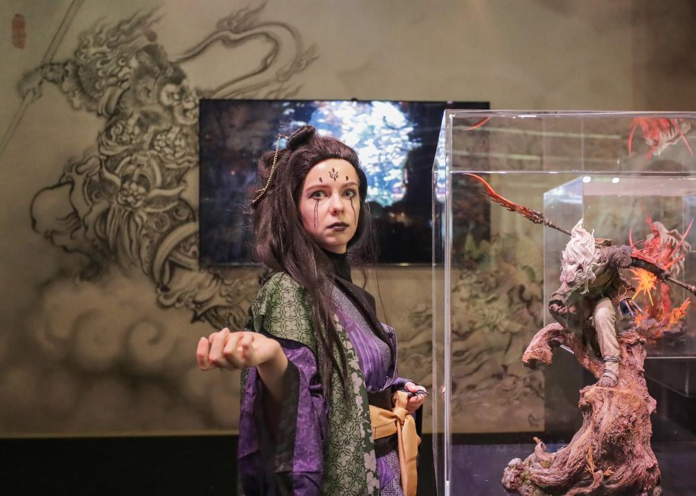 8月20日,在德國(guó)科隆,一名《黑神話:悟空》游戲角色扮演者在游戲科學(xué)展臺(tái)與模型合影。(新華社記者 張帆 攝)