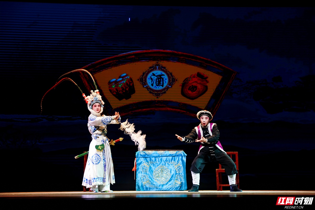 臺(tái)上,湘劇折子戲《攔馬》正演到酣處。楊八姐與焦光普在方桌之間騰挪跳躍,高難度的“盜牌”舞蹈與椅子功引得臺(tái)下掌聲不斷。