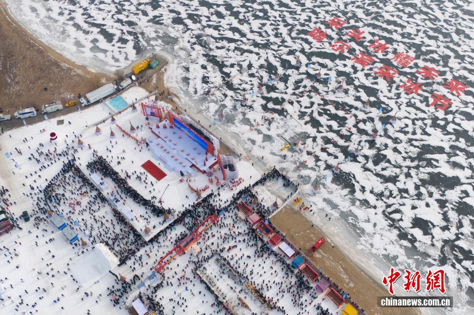 12月7日,第六屆哈爾濱采冰節在松花江北岸沙灘部落啟幕。在活動當天,采冰人身著傳統服飾,在封凍的松花江上取晶瑩剔透的“頭冰”。此外,在活動現場,游客還可以在冰雪大集市上,品嘗江水燉江魚、大鍋煮餃子等特色美食。從此日開始,松花江所采的冰將被送往冰雪大世界,構筑起新一年的冰雪王國。圖為活動現場。(無人機照片)