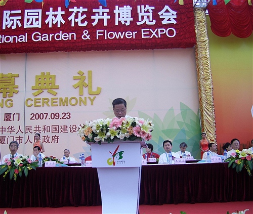 中國臺灣網9月24日廈門消息 第六屆中國國際園林花卉博覽會昨天在福建廈門隆重開幕,全國人大副委員長許嘉璐、全國政協副主席羅豪才、福建省人民政府省長黃小晶、建設部黨組書記姜偉新、廈門市委書記何立鋒,以及國臺辦、建設部有關部門和廈門市領導、港澳臺和大陸參展城市代表等出席了上午的開幕式。