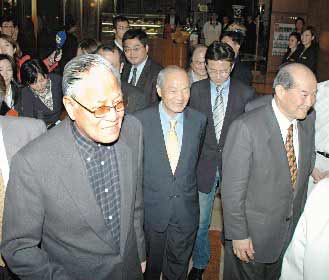 李登輝(左)昨晚宴請“獨派”人士,臺當局前“中選會主委”黃石城(中)也受邀,李登輝認為要解決臺灣當前政治危機最優先的辦法,就是“政局重組,建立本土派的第三勢力”!堵摵蠄蟆酚浾吡纸s攝