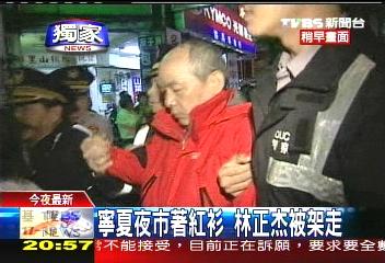 嗆扁也在臺(tái)北發(fā)生!陳水扁23日晚間到臺(tái)北寧夏夜市吃蚵仔面線,“紅衫軍自主公民協(xié)會(huì)”會(huì)長(zhǎng)林正杰和幾位“紅衫軍”成員在街口透過(guò)廣播高喊“阿扁下臺(tái)”,警方趕緊前往處理,并將林正杰帶離現(xiàn)場(chǎng)。