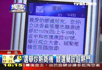 中國臺灣網(wǎng)12月18日消息 據(jù)臺灣“TVBS”報道,臺灣地區(qū)“立委”選舉倒數(shù)25天,參選人使出渾身解數(shù)拜票,手機短信成了當前最受歡迎的宣傳管道,電信業(yè)者預估商機至少逼近5千萬(新臺幣,下同)。