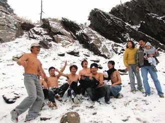 臺(tái)灣合歡山昨天降下瑞雪,云林環(huán)球技術(shù)學(xué)院的學(xué)生結(jié)伴賞雪,他們不畏寒冷,脫掉上衣,在雪地中打滾,高喊“不冷!耶!”展現(xiàn)年輕人的熱力。(聯(lián)合報(bào)圖)