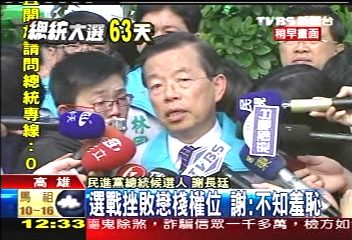 報道稱,謝長廷重批,如果現在還有人想要戀棧自己的職位,就是不知廉恥。他希望未來“新閣揆”有新氣象,能夠避免國民黨一黨獨大。他呼吁民眾“320大選”支持他。(章潘)