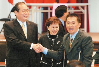 國民黨昨天舉行臺“立法院副院長”黨內(nèi)假投票,曾永權(quán)(左)在第二輪投票勝出后,受到另兩位角逐者徐中雄(右)與洪秀柱(中)的道賀。(聯(lián)合報圖)