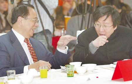 臺當局“行政院長”張俊雄(圖左)23日宣布“內閣”提前總辭,張俊雄強調此舉是依照“憲政”慣例;晚間張俊雄參加“行政院”年終餐敘時與“副院長”邱義仁(圖右)談笑風生,邱義仁還差點嗆到。(臺灣《中國時報》發圖 范揚光、陳君瑋攝)