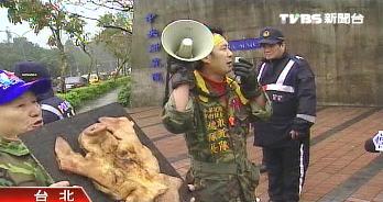 臺“愛國同心會”送豬頭抗議。(臺灣TVBS圖)