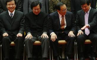 臺當局“行政院長”張俊雄(右二)率總辭后的全體“閣員”拍畢業照留念。臺灣“中央社”記者蘇圣斌攝