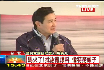 中國(guó)臺(tái)灣網(wǎng)2月4日消息 據(jù)臺(tái)灣媒體報(bào)道,在農(nóng)歷新年即將來(lái)臨之際,國(guó)民黨2008參選人馬英九今天跟網(wǎng)友舉辦了一場(chǎng)見(jiàn)面會(huì),馬英九通過(guò)網(wǎng)絡(luò)向網(wǎng)友拜年。見(jiàn)面會(huì)上馬英九痛批謝長(zhǎng)廷近期的言行就像特務(wù)頭子。
