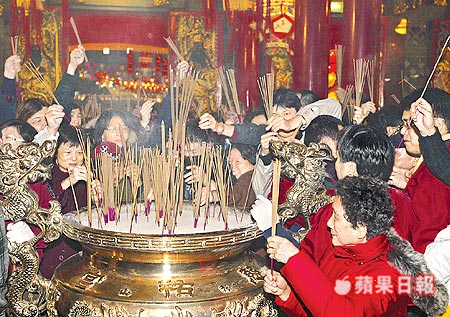 昨晚9時(shí)不到,臺(tái)中縣大甲鎮(zhèn)瀾宮就涌進(jìn)六七百人等候搶頭香。廟門一開、信眾沖入,香爐瞬間插滿香柱。搶得頭香的陳奕瑋(24歲)是一名大學(xué)生,他說,因?yàn)?年前搶到頭香后,覺得一整年運(yùn)氣都不錯(cuò),今年是連續(xù)第4年來。