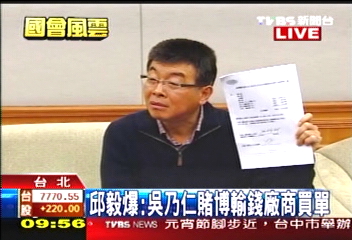 據(jù)報(bào)道,邱毅今天出示資料說,“吳乃仁當(dāng)時(shí)擔(dān)任臺(tái)糖董事長(zhǎng),龔照勝是擔(dān)任證券交易所董事,回來以后不到半年,龔照勝就接了臺(tái)糖董事長(zhǎng),接著當(dāng)了‘金管會(huì)主委’,吳乃仁就接了臺(tái)灣證券交易所的董事長(zhǎng),當(dāng)時(shí)接受游戲橘子(廠商)的招待,到濟(jì)州島皇冠假日賭場(chǎng)賭博,輸?shù)舻腻X全都是由游戲橘子幫他們負(fù)擔(dān),而且一賭就輸?shù)袅?00多萬港幣,這個(gè)叫小賭嗎?”