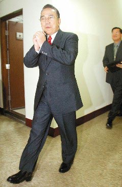 對媒體披露陳水扁當局秘密成立鐽震公司進行軍火買賣,臺當局“國防部長”李天羽(左)在“立委”要求下,上午低調緊急赴“立法院”國民黨團說明。臺灣《聯合晚報》記者林俊良攝