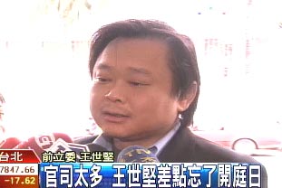 幸好一大早,有記者打電話提醒,王世堅才趕快出門,不過人到了法院,要開什么庭,他自己都搞不清楚。王世堅:“是邱毅的案子嗎?”記者:“對!蓖跏缊裕骸拔冶桓嫣嗔,我也搞不清楚。”(高大林)