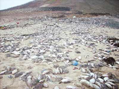 中國臺灣網2月18日消息 四面環海的澎湖望安離島,連日來四周海灘布滿了魚尸!疤膳铝耍陌俟唛L的海灘全是魚尸!蓖仓袑W校長洪嬡慧表示出她的驚駭,她說望安有7個海灘,只走了2處海灘,情況都一樣嚴重。