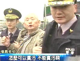 陳水扁在會上依舊鼓吹推動“入聯公投”,但沒想到臺下卻有民眾嗆扁,嗆扁民眾隨即被警察帶走;但又有民眾高喊:“阿扁下臺!”嗆扁老伯念念有詞:“怎么可以貪污,不能貪污!”老伯隨后同樣也被架走。(高大林)