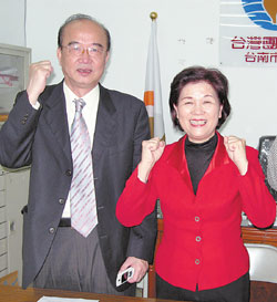 前臺(tái)聯(lián)黨“立委”錢(qián)林慧君(右)與擔(dān)任臺(tái)聯(lián)黨中央黨部秘書(shū)長(zhǎng)的丈夫錢(qián)橙山(左)表態(tài)力挺馬英九。(臺(tái)灣《中國(guó)時(shí)報(bào)》圖片)