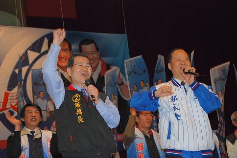 據(jù)臺灣媒體報道,蕭萬長今天參加新竹縣競選總部成立大會,授戰(zhàn)旗給新竹縣長鄭永金及新竹縣13鄉(xiāng)鎮(zhèn)市代表。他在致詞時做上述表示。