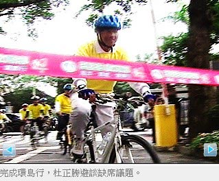 從桃園騎回臺北,杜正勝終于完成單車環島行,總共騎了1271公里,整個人黑了一圈。平常很低調的夫人陳芳妹也陪著杜正勝,完成最后一段行程,杜正勝顯得很開心,但被媒體問到缺席臺灣“立法院”會議的敏感話題,杜正勝立刻封口。